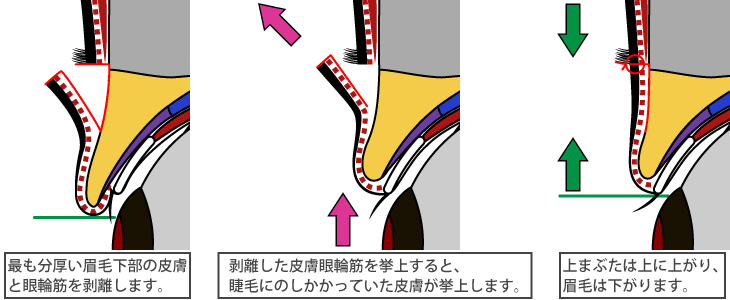 ・下のイラストのように、ゆるんで上方にずり上がった挙筋腱膜付着部を探し出し、元通りの位置に引き出して固定します。